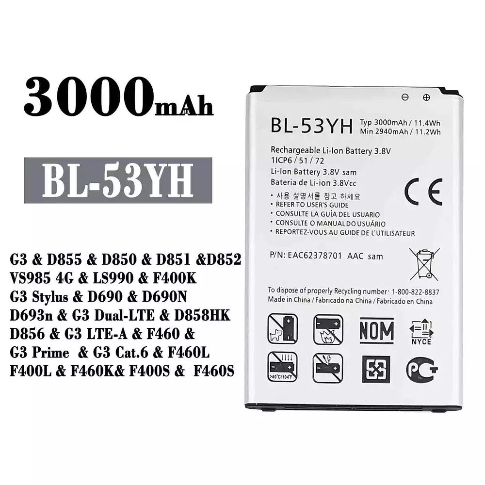 Bateria BL-53YH para LG G3 / D855 / D850 / D851 / D852 / VS985 4G / LS990 / F400K / G3 Stylus / D690 / D690N / D693n / G3 Dual-LTE / D858HK / D856 / G3 LTE-A / F460 / G3 Prime / G3 Cat.6 / F460L / F400L / F460K / F400S / F460S