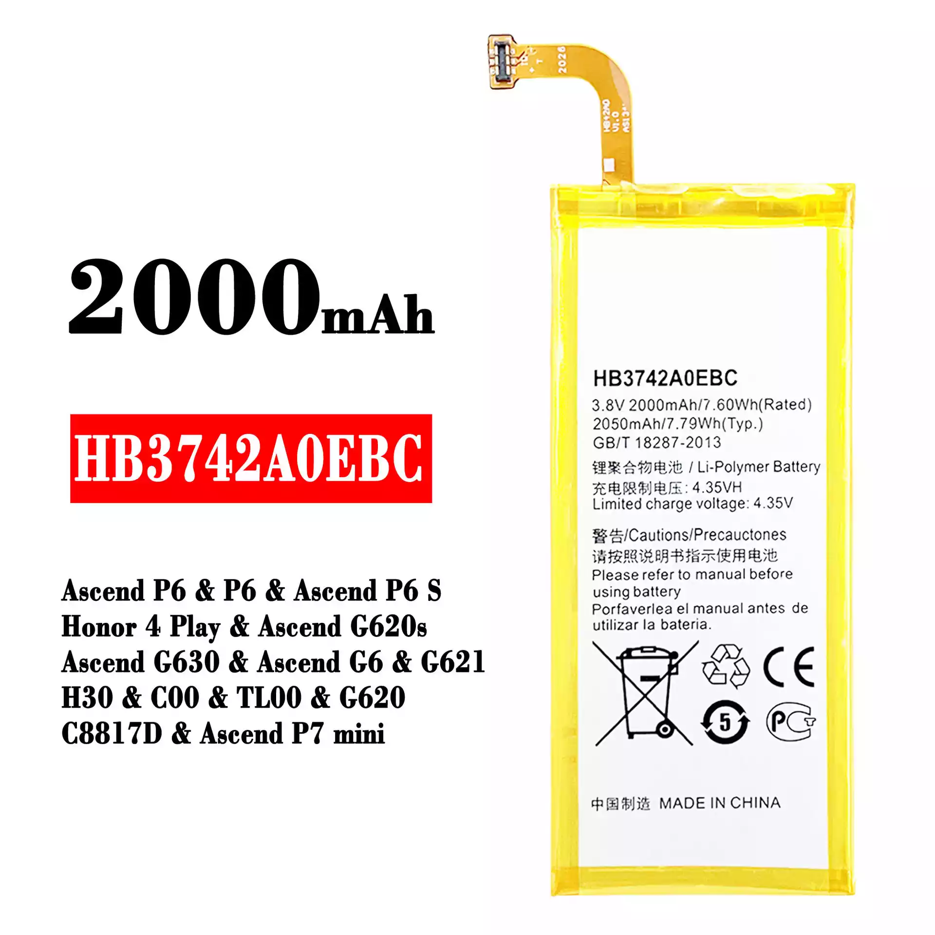 Bateria HB3742A0EBC para HUAWEI Ascend P6 / P6 / Ascend P6 S / Honor 4 Play / Ascend G620s / Ascend G630 / Ascend G6 / G621 / H30 / C00 / TL00 / G620 / C8817D / Ascend P7 mini