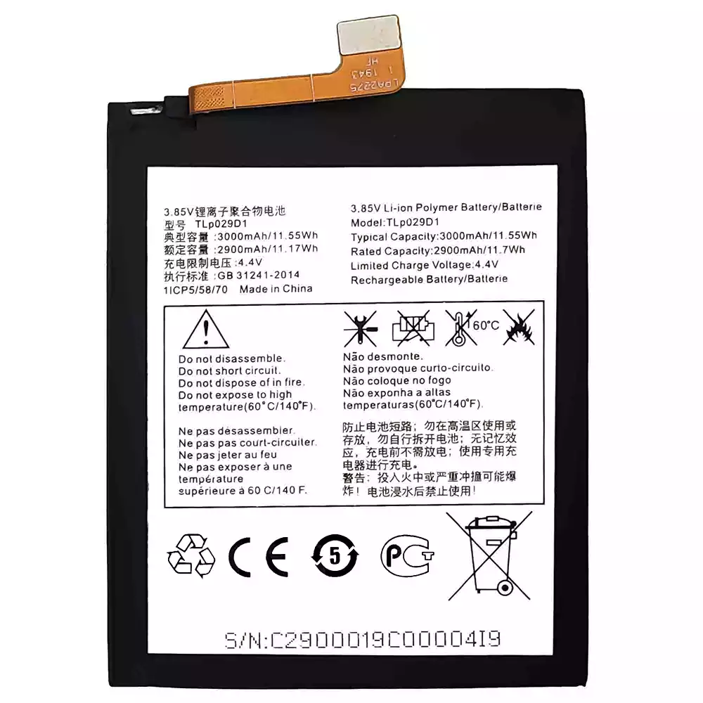 Bateria TLP029D1 para Alcatel 3 2018 / 0T-5052 / 5052D / 5052A / 5052Y / 5 / 0T-5086 / 5086D /5086Y / 5086A / 3L 2018 / OT-5034 / 3x 2018 / 0T-5058 / 50581 / 5058T / 5058Y / 5058A / 5058J